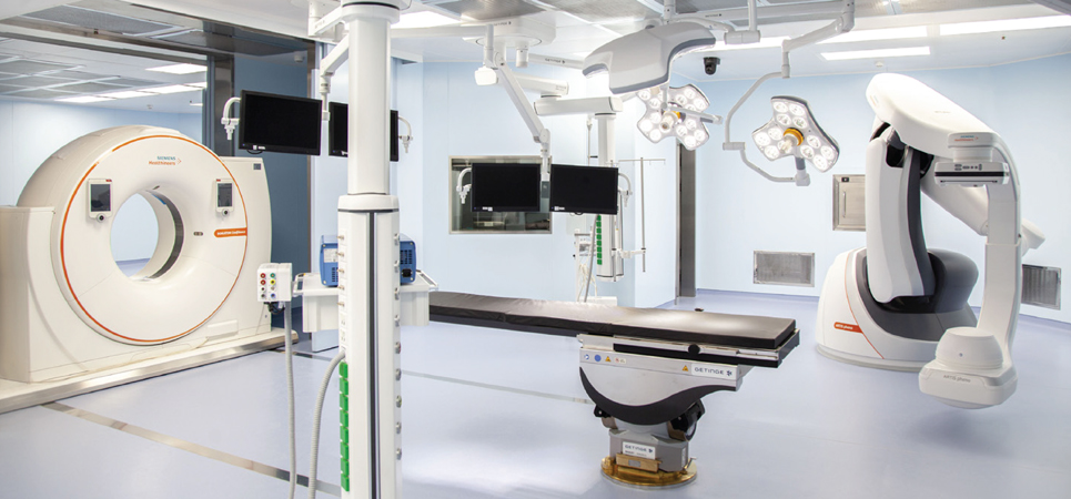 Hybrid Operating Room (2 unit): Dipakai untuk menangani operasi kompleks. Oleh karenanya dilengkapi dengan Robotic Laparoscopy, CT Scan intraoperatif dan Robotic Angiography.